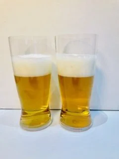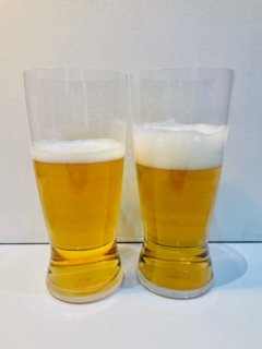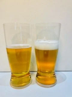The same base beer was poured simultaneously into both glasses, and photos were taken at 3 key time points to document foam performance over time:
